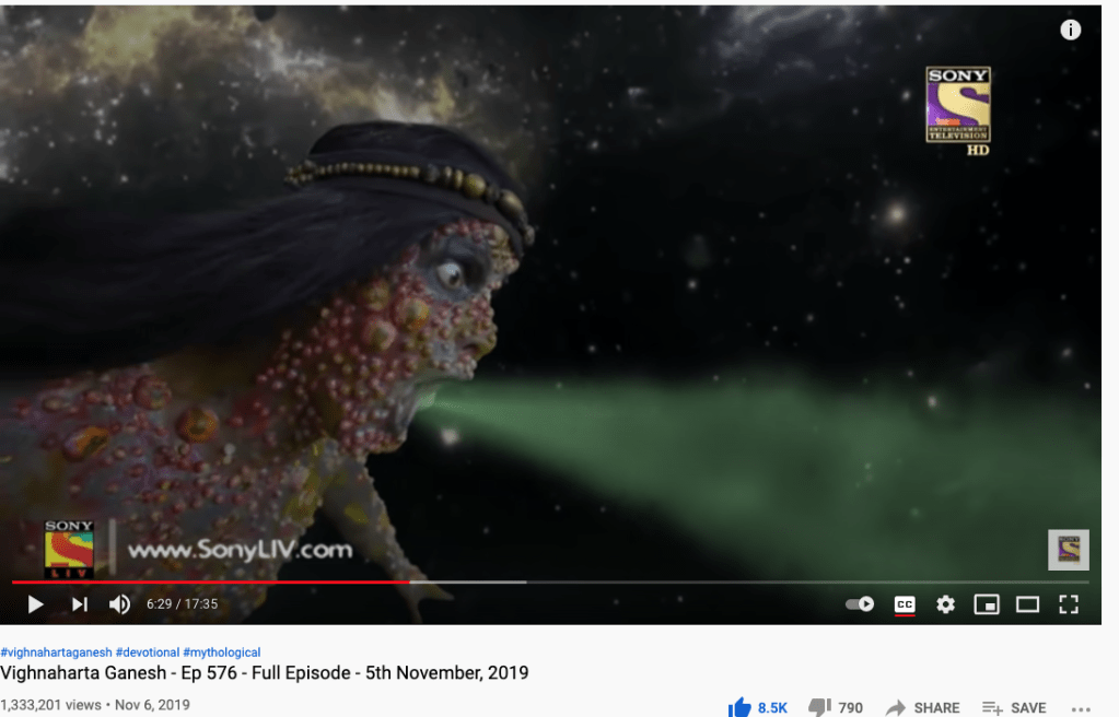 The make up and special effects artists took pains to make the young vibrant actresses appear to age and to succumb to fearsomely gruesome diseases. Just when you think all is lost, Mata appears superimposed over the arms of each goddess like a tattoo. Then Sri Ganesh narrates all creatures have the Goddess residing within them. Then he says, that those who invoke the name of the Goddess (alas this part wasn’t properly translated) and chant