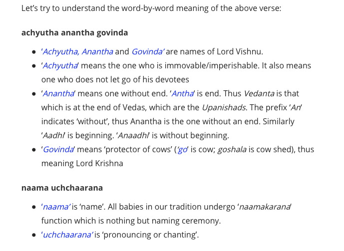 The next step was to find out if anyone had recorded it and luckily, I found an OUTSTANDING, renowned singer named Jayateerth Mevundi. Better yet I found Mr. Mevundi performing the sloka. However, I could not make out what he was singing except for the words “Achyuth Anantha Govinda”. I did a few more searches and found all of the words but with a “meaning” that did not make sense. I wanted what I think of as a real translation.