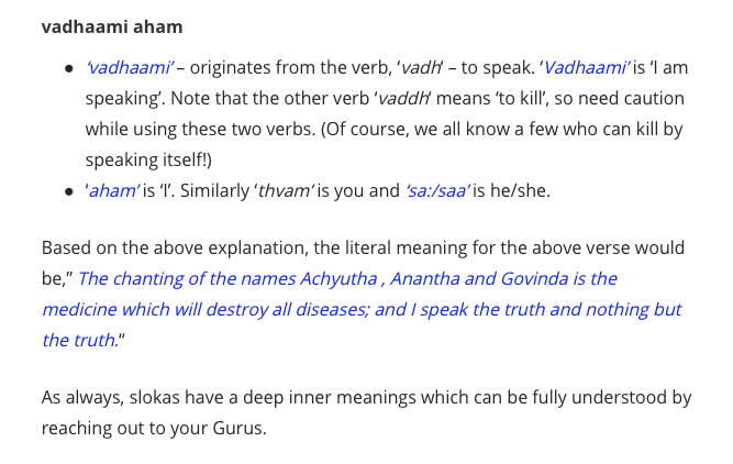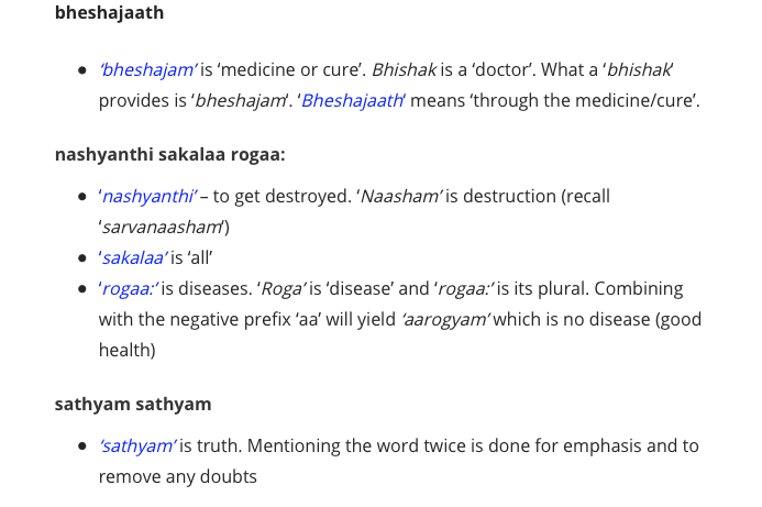 Here are the screen shots from this wonderful blog entry by Rangarajan Parthasarathy because he has formatted this so well, I do not think I should even try to quote it. All of a sudden the strange “meaning” I found on other sites, made sense! The sloka really does state that this is the truth or I speak the truth. The comments on this sloka on various sites were interesting in that there were first hand accounts of how reciting this properly “cured” or at least greatly alleviated ailments.