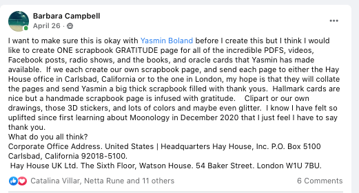 On Monday, April 26, 2021 during a Spring snowstorm with the daily moon moving from Libra to Scorpio, I posted on Yasmin Boland’s Subscriber Facebook Page that I wanted to create a GRATITUDE scrapbook page.