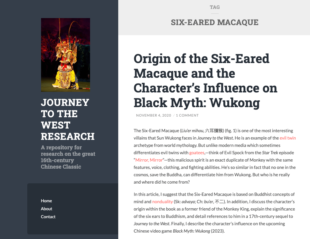 I posted a comment on his Facebook page and let him know about the Nezha movie and the Six Eared Macaque and he wrote back “That movie has driven a lot of traffic to my site for some reason. My article on the Six-Eared Macaque got 3,265 views in April, which is tenfold the normal monthly views”.