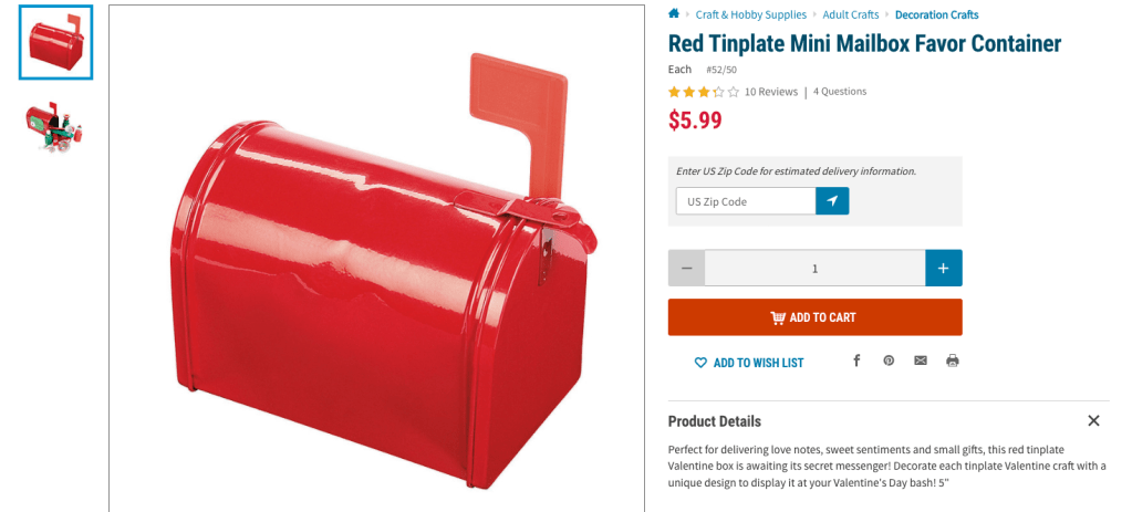 Last year in 2021, I finally found a Valentine mailbox on sale at Joanns. Mine is slightly different with a white trim but any mailbox will do.
