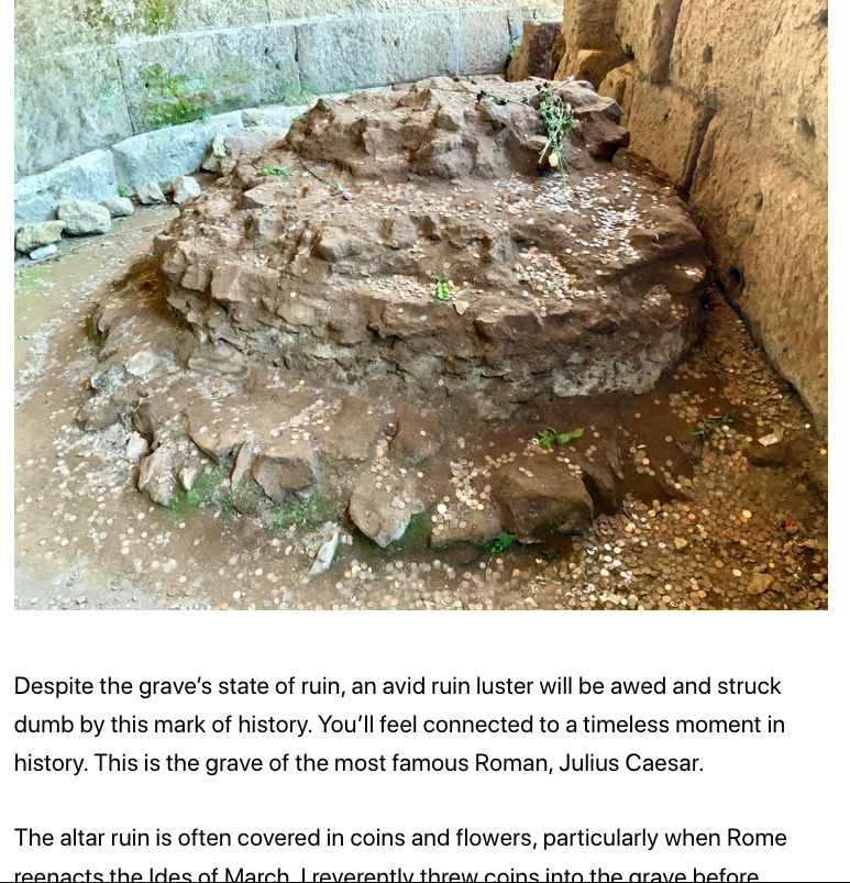 I did not buy a flower for Julius Caesar’s grave in the Roman forum but I did honor the grave. At least in May 2003, people were STILL bringing gifts to the dead Roman emperor who on the Ides of March was stabbed to death by his closet associates and senators. There’s a wonderful blog post so you can visit virtually. The day I was there the grave was COVERED with gifts. Even after 2,000 years people still want to honor CAESAR! But are they also trying to talk to him?