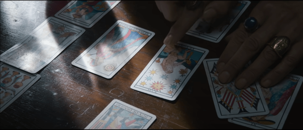 I froze the frame in the hopes of 1) identifying the deck – It looks like it’s the Marseilles and 2) figuring out the spread and the reading. I found discussion boards and searched images of the decks and then voilà!