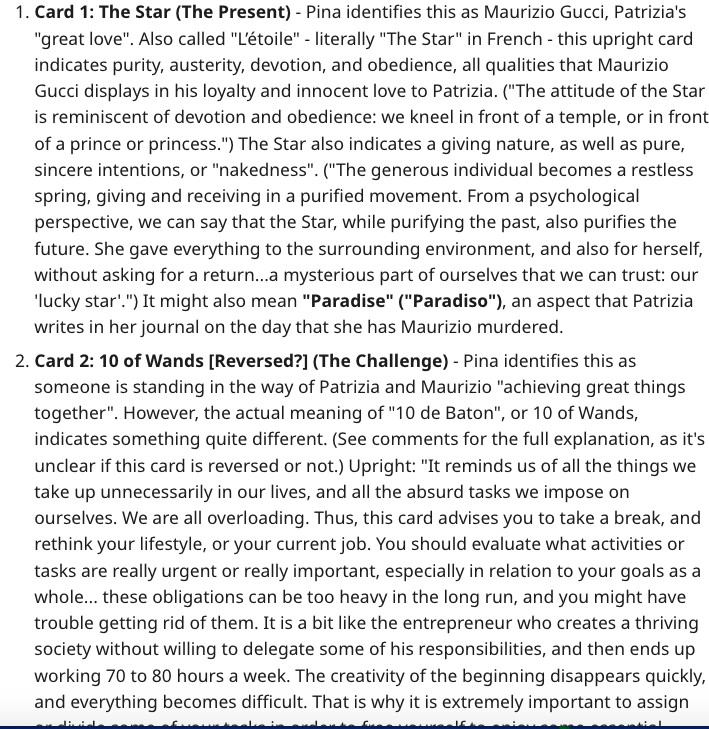 Card 1: The Star (The Present) – Pina identifies this as Maurizio Gucci, Patrizia’s “great love”. Also called “L’étoile” – literally “The Star” in French – this upright card indicates purity, austerity, devotion, and obedience, all qualities that Maurizio Gucci displays in his loyalty and innocent love to Patrizia. (“The attitude of the Star is reminiscent of devotion and obedience: we kneel in front of a temple, or in front of a prince or princess.”)