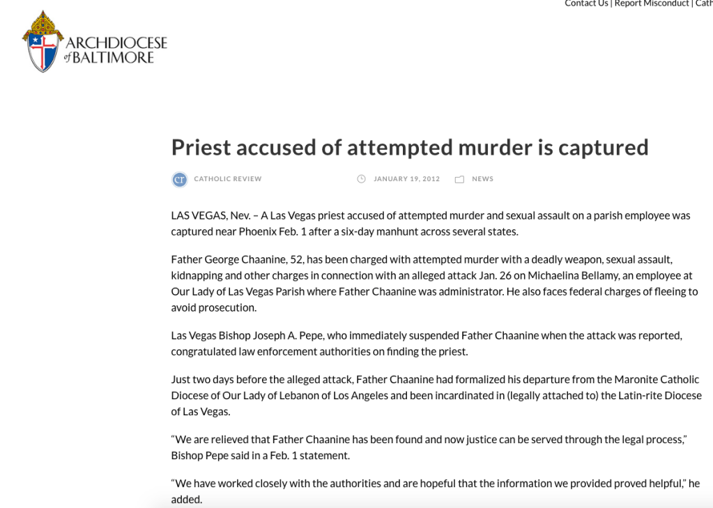 A few days later, on America’s Most Wanted – the same show that helped law enforcement find the infamous psychopath, John List, Father George’s face was plastered all over national television. I called Margot Karam at St Sharbel Maronite Catholic Church to find out what had happened. The entire parish was scandalized and furious. “Father” George had left, I knew that, to become head priest of a MARONITE church in Las Vegas. Once there, however, he got lured over to a wealthy ROMAN CATHOLIC church and it was there that he went insane and almost killed a woman i the choir who he lusted after! I can’t make this stuff up. I CAN’T! Father George had shown an interest in me and it’s one reason why Harry never accepted any of his invitations to his home for dinner. Mmmmm