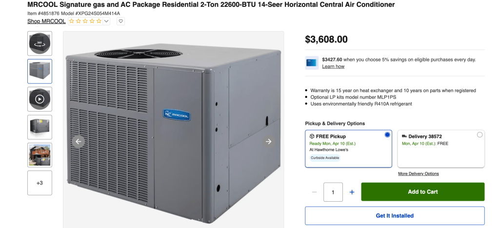 Cost of an air conditioner assuming the feds don’t ban those either. Don’t laugh. I just heard some in Congress are ranting about AC also! This looks like it’s both an AC and a furnace. Gotta ask.