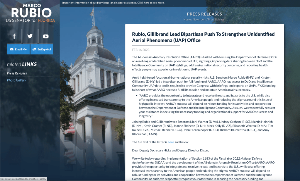 All of which leads up to yesterday, Friday, June 9, 2023. News broke last week that David Charles Grusch, 36, a decorated former combat officer in Afghanistan, a veteran of the National Geospatial-Intelligence Agency (NGA) and the National Reconnaissance Office (NRO) who served as the reconnaissance office’s representative to the Unidentified Aerial Phenomena Task Force (2019-2021) and who was NGA’s co-lead for UAP analysis (late 2021 to July 2022) had come forward as a whistleblower.