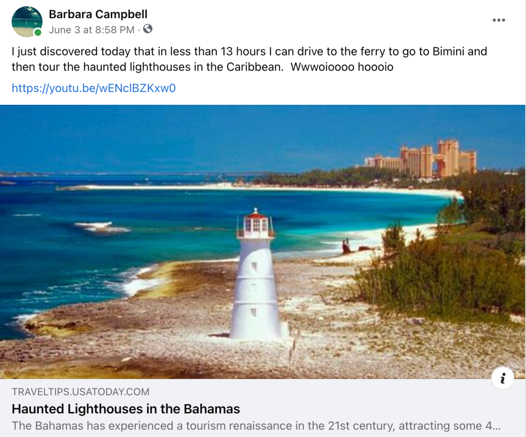Keep in mind, I had a crew on the property reassembling and painting my back deck. My housemate doing landscaping, and me trying to design a floor plan for my new barndominium. Earlier in the week, I had discovered that my new home in Crossville, Tennessee is only a 13 hour drive to Miami where I can visit my Cuban mage friend. From there I can drive up to Ft. Lauderdale and get on a FERRY – a real FERRY BOAT and sail over to the island of Bimini! I posted on Facebook that I was super psyched cause I wanted to research the haunted lighthouse and take the tour of the haunted shipwrecks.