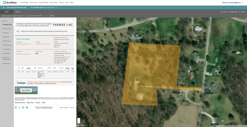 One of the subscription databases one can use is AcreValue. I used my last free full report yesterday. If I want to upgrade it’s $29 a month. The free account let me generate a soil map which is really useful if you want to know if it’s worth paying for a soil perc (percolation) test to see if you can have a septic installed or not.