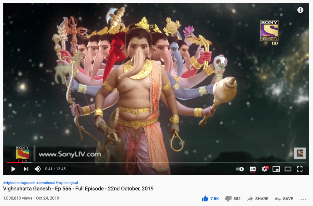 I no longer live near a temple, although there is a temple dedicated to Sri Ganesh near Salt Lake City (275 miles from my house). On August 8, 2019 I stumbled upon the TV series Vighnaharta Ganesh on YouTube. Episode 1 had aired in India on August 22, 2017 so I was two years behind and they had planned 2,000 episodes! I had previously watched an animated series but Sony has produced a series with some of the best CGI you could ever hope to see. And so, I began to watch every episode. Some do not have subtitles but there is a synopsis on Telly Updates. If you have the patience to read subtitles, and the patience to endure highly stylized pacing (Beware in these types of epics the director sticks close to the original stage feel so if Sri Ganesha has a stomach ache or says something funny, the camera will pan to ALMOST every single character in the scene – or in heaven. PAUSE, show the OH HOW CUTE or ON NO GASP expressions and then resume the story. It’s like sitting through Kabuki at times. Maybe not the best example but if an American were editing the series a 25 minute segment would get cut to probably 15 or less. BUT bare with it.