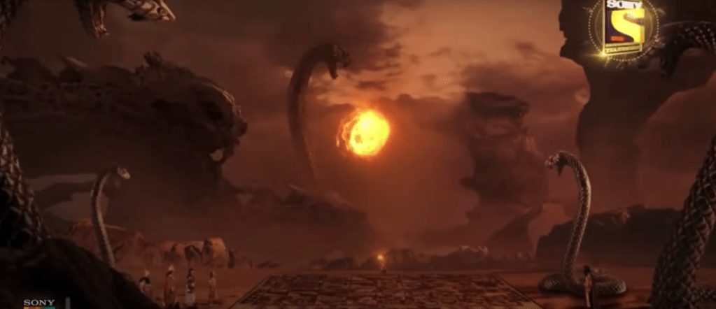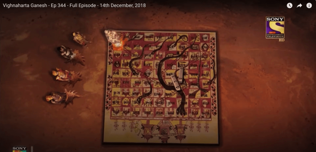The most spell binding story arc is about Sri Ganesha’s brother, Kartikeya who has to battle a demon (asura) in a game of Snakes and Ladders – what I played as a kid as Chutes and Ladders.